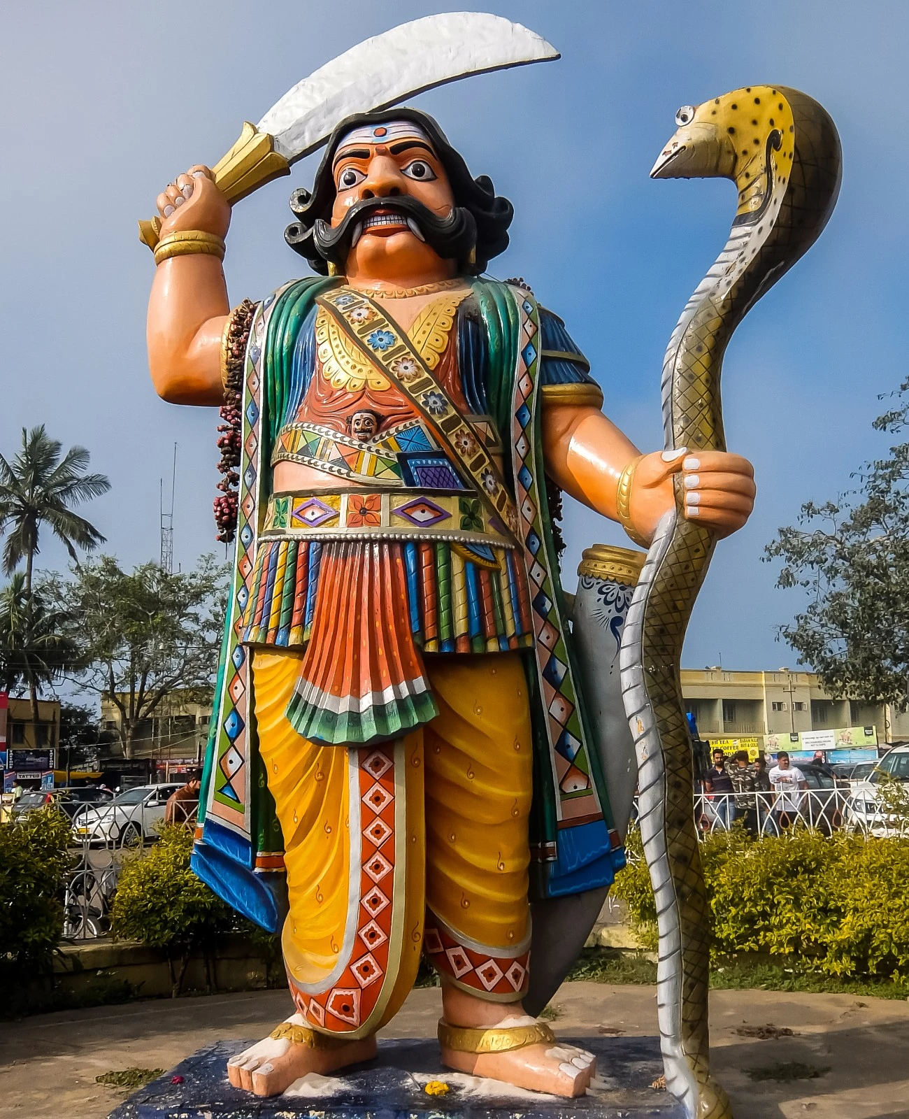 The statue you come across while climbing up to the top of Chamundi hill is of Mahishasura, carrying a snake and a sword.