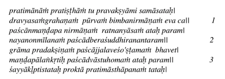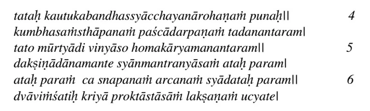 “Now, I will explain briefly the process of installation of the idols within the shrine. The installation is performed through a series of 22 activities. The first one is the collection and arranging of the required materials. Second is the structuring of the idol. Then, construction of the pavilion. Next, fixing the gems. Opening of the eyes of the idol, purification of the idol, circumambulatiing the village, keeping the idol immersed in water, decoration of the pavilion, fire-ritual related to the Vaastu deities, designing the couch, perfecting the idol, tying up the protective thread, placing the idol to be in recumbent pose on the couch, arranging the vessels (kumbhas), dedicating the idol, doing the nyasa of the actual form of the Deity, offering the oblations, offering the ceremonial fees, the Nyasa of the mantra, preparation of snapana and adoration – these are 22 activities prescribed for the installation. I will give the details of these activities, one by one.”